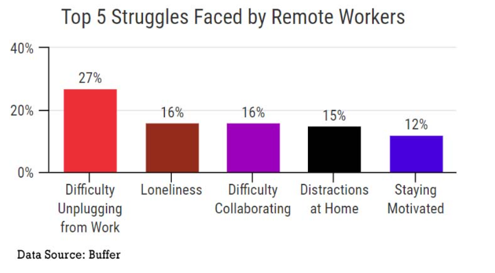 The biggest struggle working in a home office is the difficulty of unplugging from work: Remote workers are 1.27 more likely to struggle to disconnect from work compared to workers that go into the office. Many remote workers suffer from an “always on” mindset when it comes to work, especially with the home office now always accessible. The boundary between when work stops and their personal life begins are often blurred. In addition, in a lot of cases managers often message remote employees even during off hours via email and text, which makes it even more difficult to concentrate on their personal life.