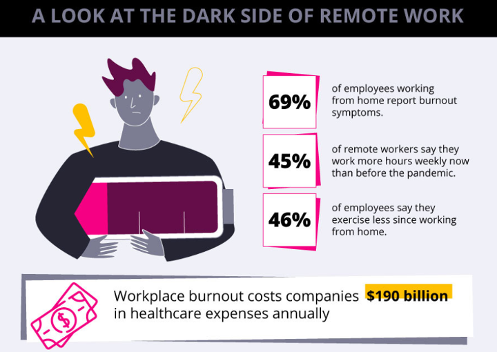 Lack of Social Support/ Loneliness: In a survey of 1,000 professionals, 76% say “lack of social interaction” was what they disliked most about working from home. Since the pandemic employees are 3x more likely to report poor mental health compared to before, revealed by Flexjobs in a study. A big part of the issue is social isolation. In the past it was easy to have a small conversation with any of your colleagues or to have a good laugh with your teammates during lunch, remote working has changed all of that. The lack of in-person interaction over time can lead to a loss of motivation, increased stress, and even depression according to experts.