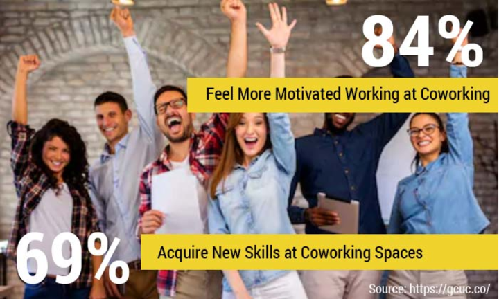 According to a GCUC survey, 84% of coworkers say working in a coworking space makes them more engaged and motivated. 69% surveyed say they have acquired news skills, and 68% say they have improved their existing skill set as a result of working in coworking spaces.