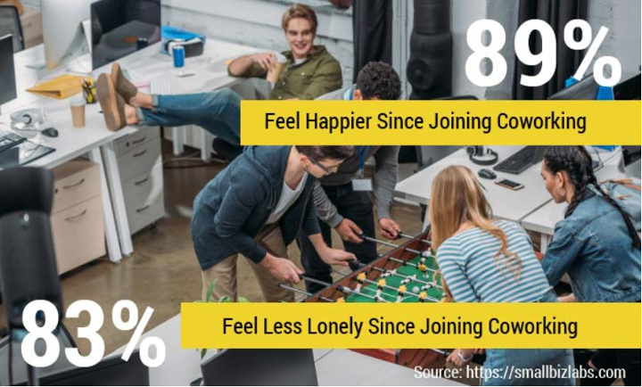 According to an extensive survey done in 2018, 89% of coworkers reported that they are happier since joining a coworking space, while 83% said that they feel less lonely.