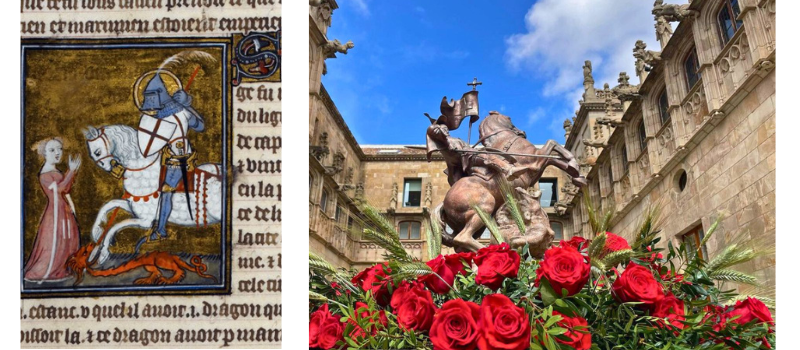 This tradition comes from the famous legend of Saint George and the dragon. The knight defeated the dragon, who was terrorizing the village and the princess, and after penetrating the dragon with his sword, Saint George gave the princess one of the beautiful red roses that spilled out of the beast’s body. And also the old medieval tradition of visiting the Chapel of Sant Jordi in the Palacio de la Generalitat, where a rose fair or ‘lovers fair’ used to take place. This is why Sant Jordi is also the patron saint of lovers in Catalonia.
